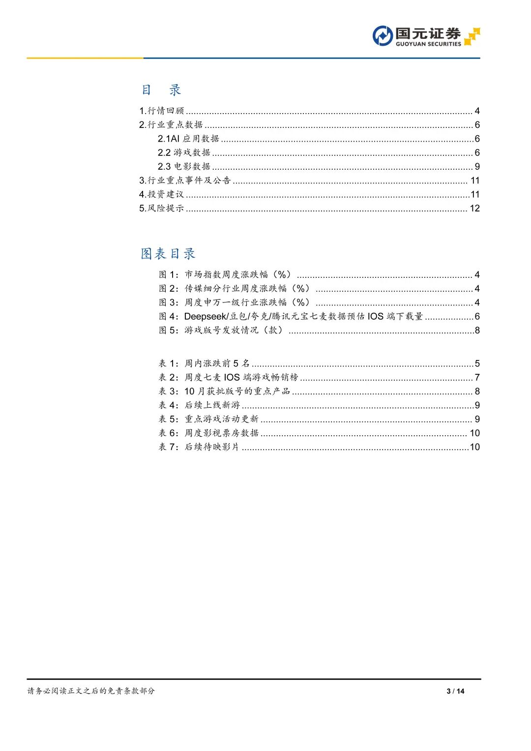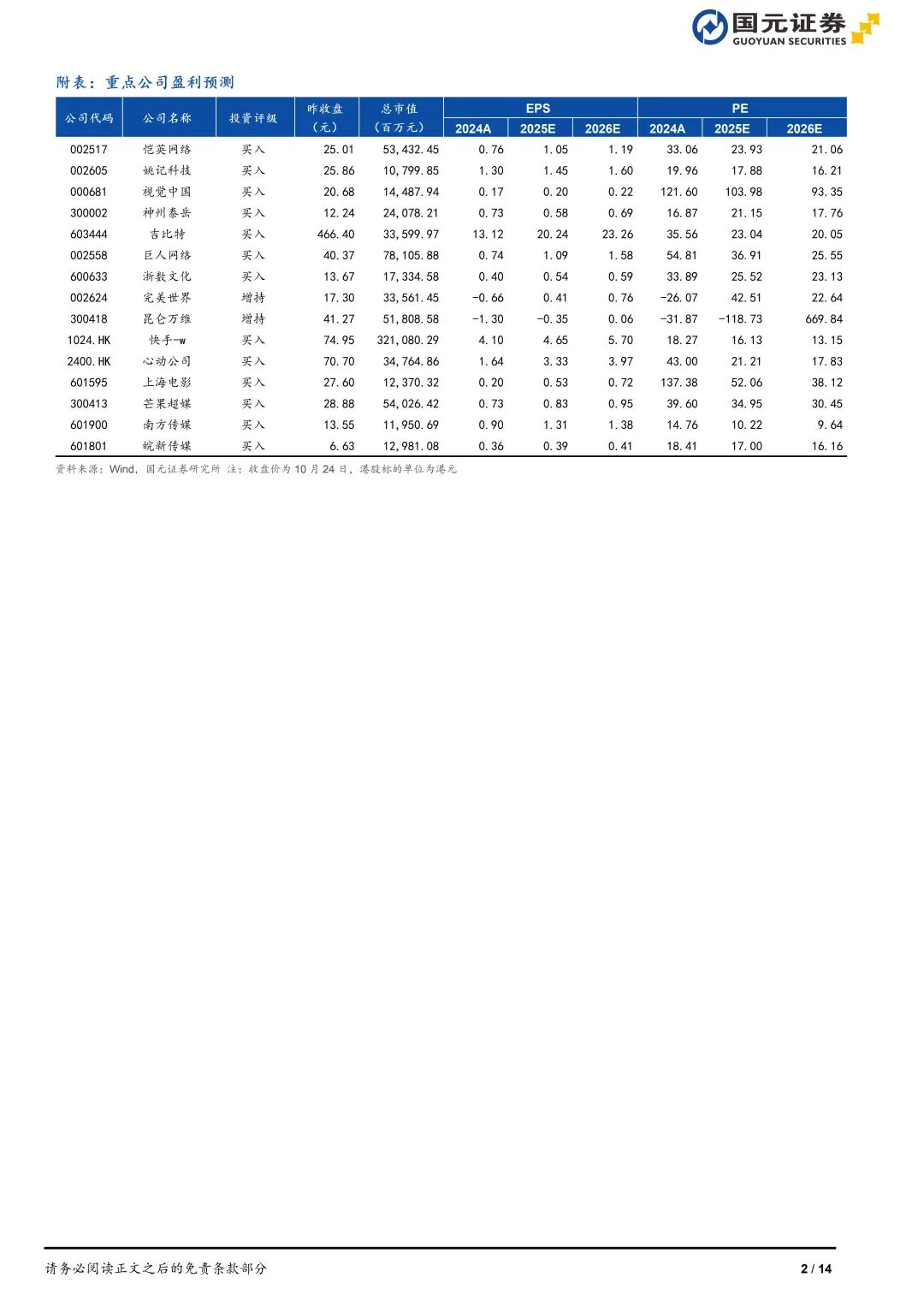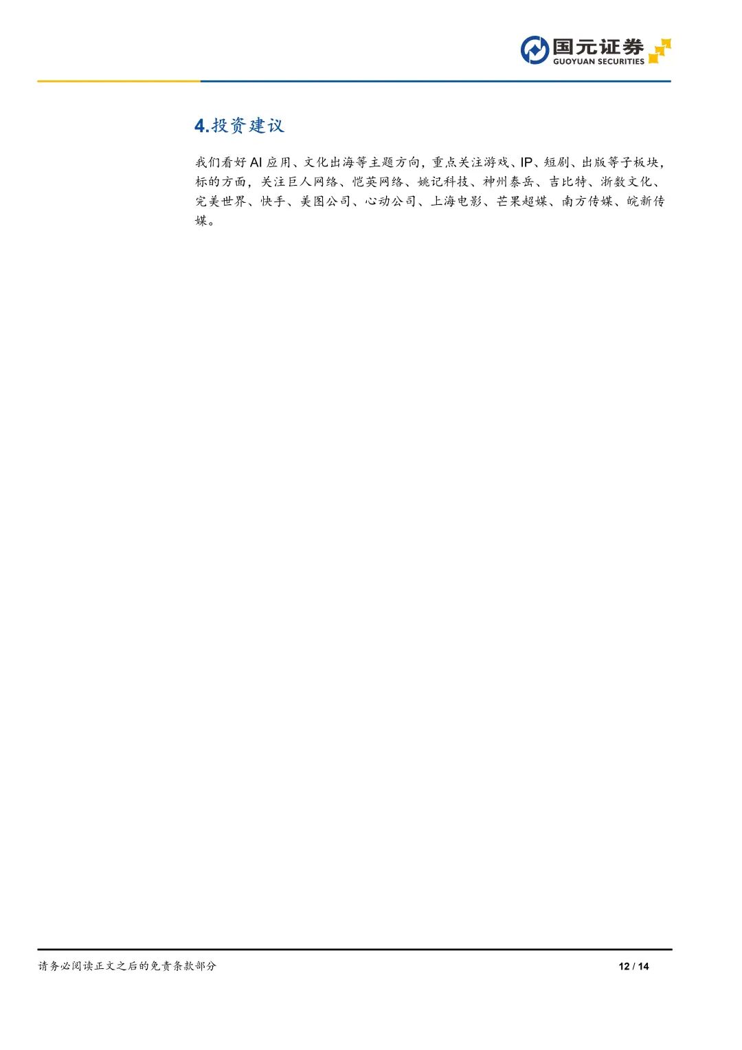 我们看好AI应用、文化出海等主题方向,重点关注游戏、IP、短剧、出版等子板块,标的方面,关注巨人网络、恺英网络、姚记科技、神州泰岳、吉比特、浙数文化、完美世界、快手、美图公司、心动公司、上海电影、芒果超媒、南方传媒、皖新传媒。