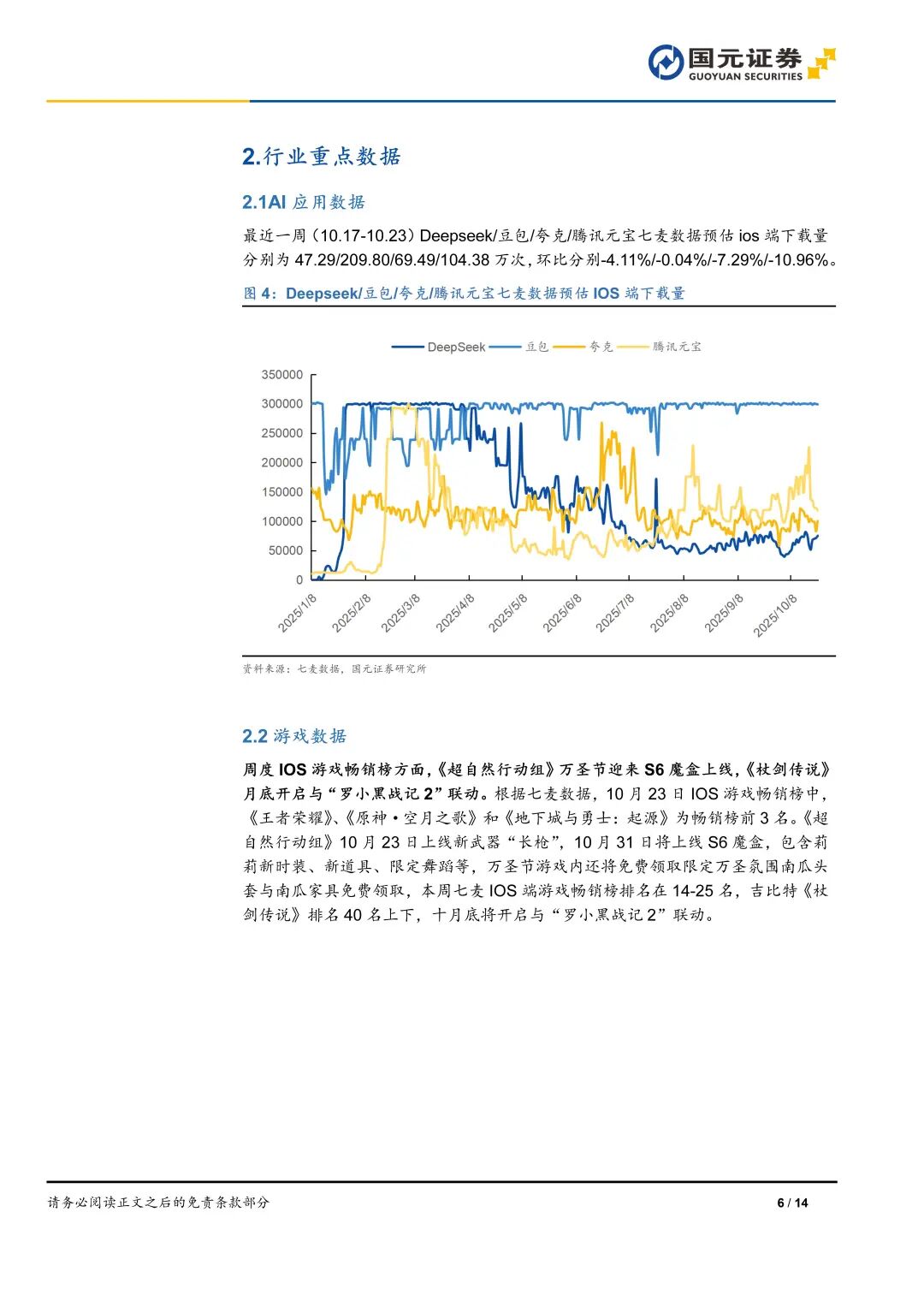 AI应用:最近一周(10.17-10.23)Deepseek/豆包/夸克/腾讯元宝七麦数据预估ios端下载量分别为47.29/209.80/69.49/104.38万次,环比分别-4.11%/-0.04%/-7.29%/-10.96%。AI应用事件方面,OpenAI首款ChatGPT浏览器发布,字节跳动 Seed 团队推出3D生成大模型Seed3D1.0,MiniMax发布最新大语言模型MiniMax M2,豆包视频生成模型1.0 pro fast正式发布。