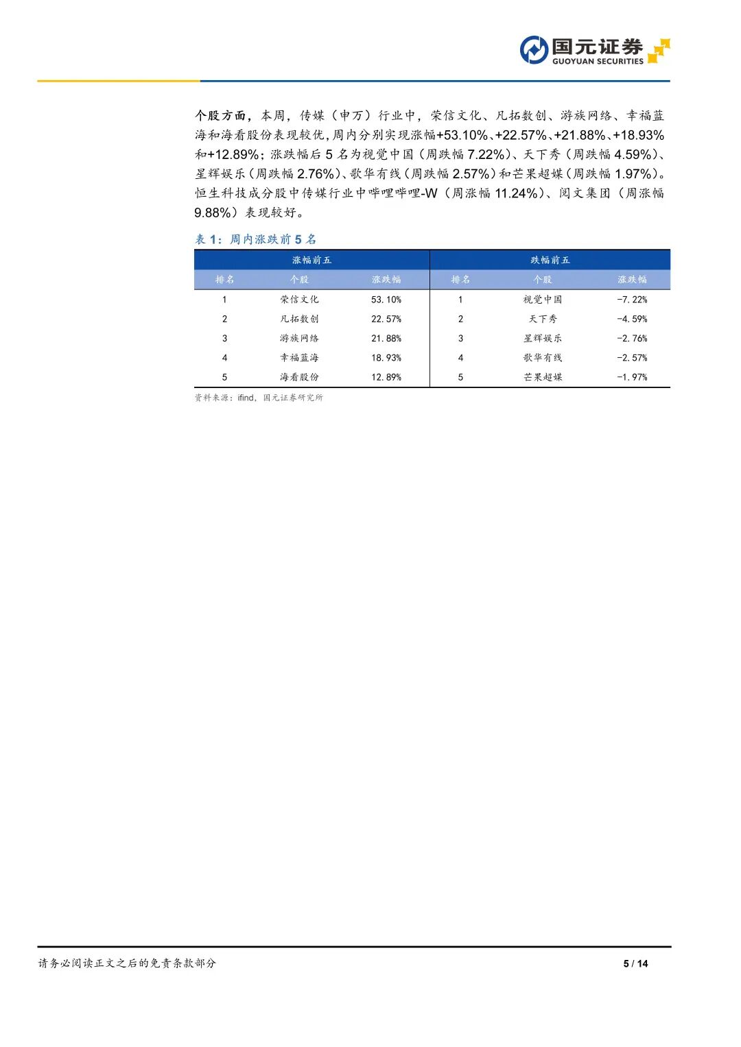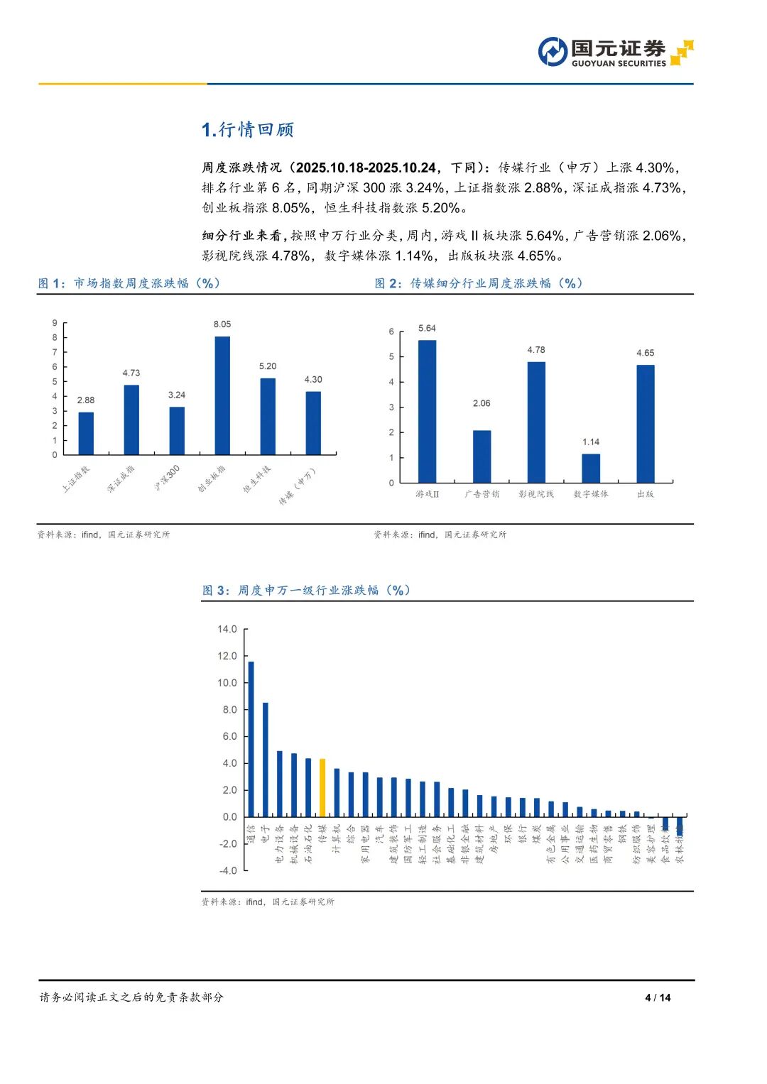 周度涨跌情况(2025.10.18-2025.10.24,下同):传媒行业(申万)上涨4.30%,排名行业第6名。荣信文化、凡拓数创、游族网络、幸福蓝海和海看股份表现较优,恒生科技成分股中传媒行业中哔哩哔哩-W(周涨幅11.24%)、阅文集团(周涨幅9.88%)表现较好。