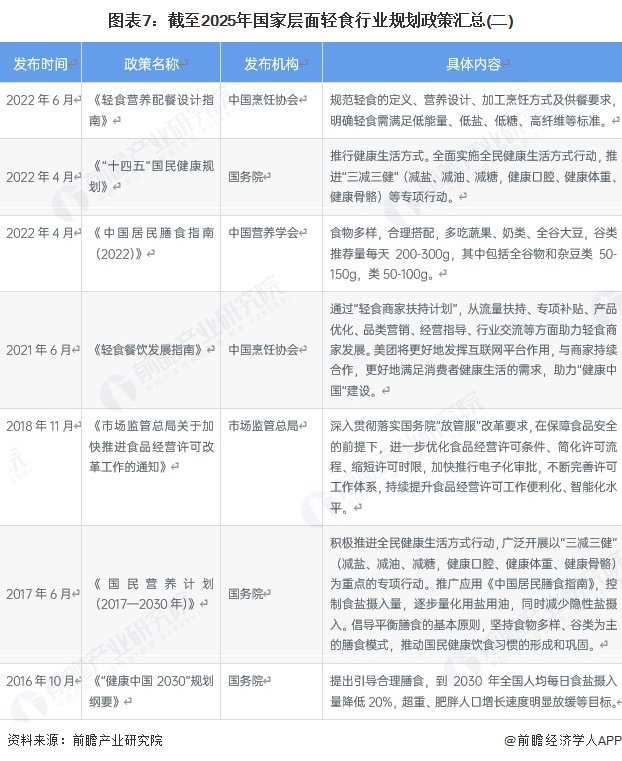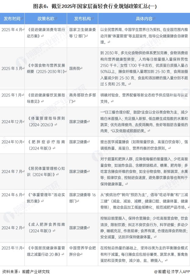 自2016年《“健康中国2030”规划纲要》起,国家持续出台政策推动健康饮食,围绕“三减三健”、合理膳食、体重管理等核心,明确食物搭配、热量控制、营养摄入等要求,2021-2022年中国烹饪协会规范轻食标准并扶持商家,2025年进一步通过专项方案和指导意见支持轻食等新业态,同时优化食品经营许可流程,全方位助力轻食行业发展。