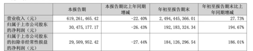 不过,从单季来看,第三季度实现营业收入约6.19亿元,同比下降22.4%;净利润为3047万元,同比下降26.43%。
