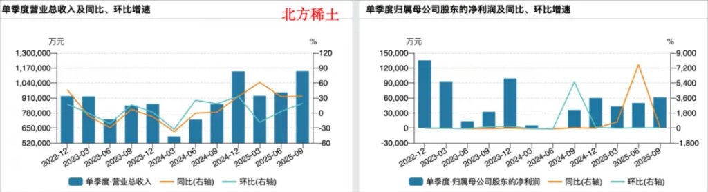 从单季来看,北方稀土第三季度实现营收114.25亿元,同比增长33.32%;归母净利润为6.1亿元,同比大幅增长69.48%。