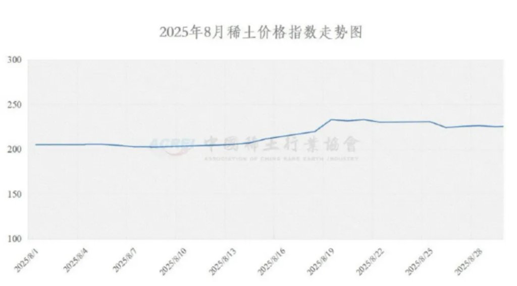 稀土市场正显现回暖迹象,以中国稀土行业协会的稀土价格指数为例,今年7月和8月,该指数出现明显上行,8月中旬创下年内新高233.2点,比2024年末上涨近43%。