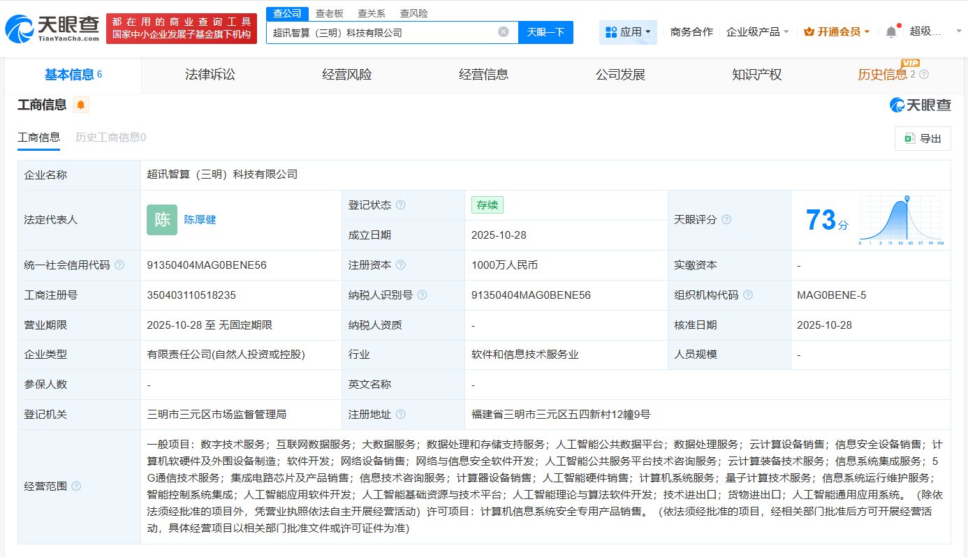每经AI快讯,天眼查App显示,近日,超讯智算(三明)科技有限公司成立,法定代表人为陈厚健,注册资本1000万元人民币,经营范围包括数字技术服务、互联网数据服务、大数据服务、数据处理和存储支持服务、人工智能公共数据平台等。股东信息显示,该公司由超讯通信(603322)、广州云上鸿图投资合伙企业(有限合伙)、广州华汇智算数字信息技术有限公司共同持股。