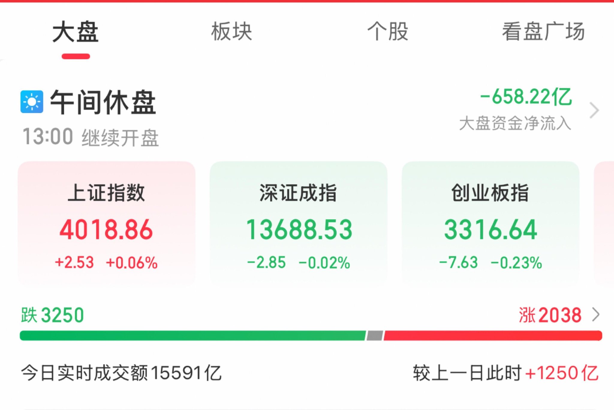 A股三大指数早盘涨跌不一,截至午盘,上证指数涨0.06%,深成指跌0.02%,创业板指跌0.23%,北证50涨2.05%。沪深京三市半日成交额15591亿元,较上日放量1250亿元。全市场超3200只个股下跌。