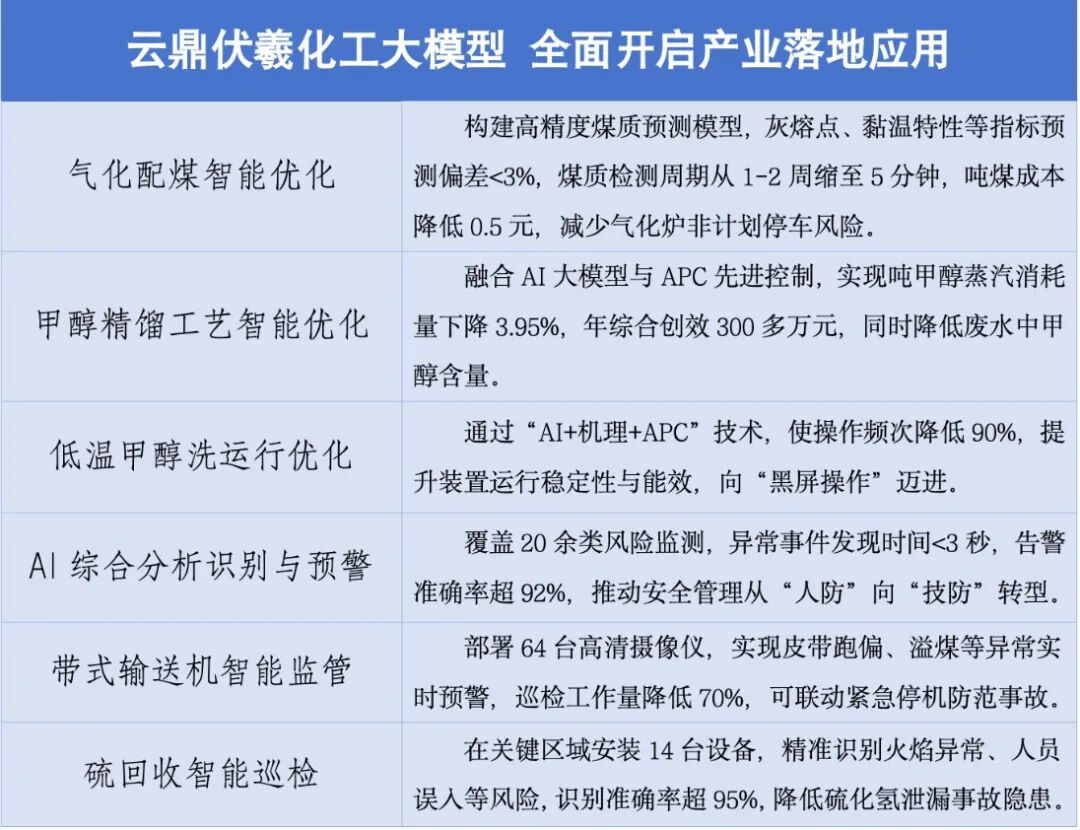 除矿山领域成果外,发布会还重磅推出“云鼎伏羲化工大模型”以及六大高价值应用场景。该模型由云鼎科技历时2年研发,深度融合化工工艺机理、专家经验、设备及质量数据等融合训练而成,已在榆林能化、鲁南化工、未来能源等化工企业落地应用。