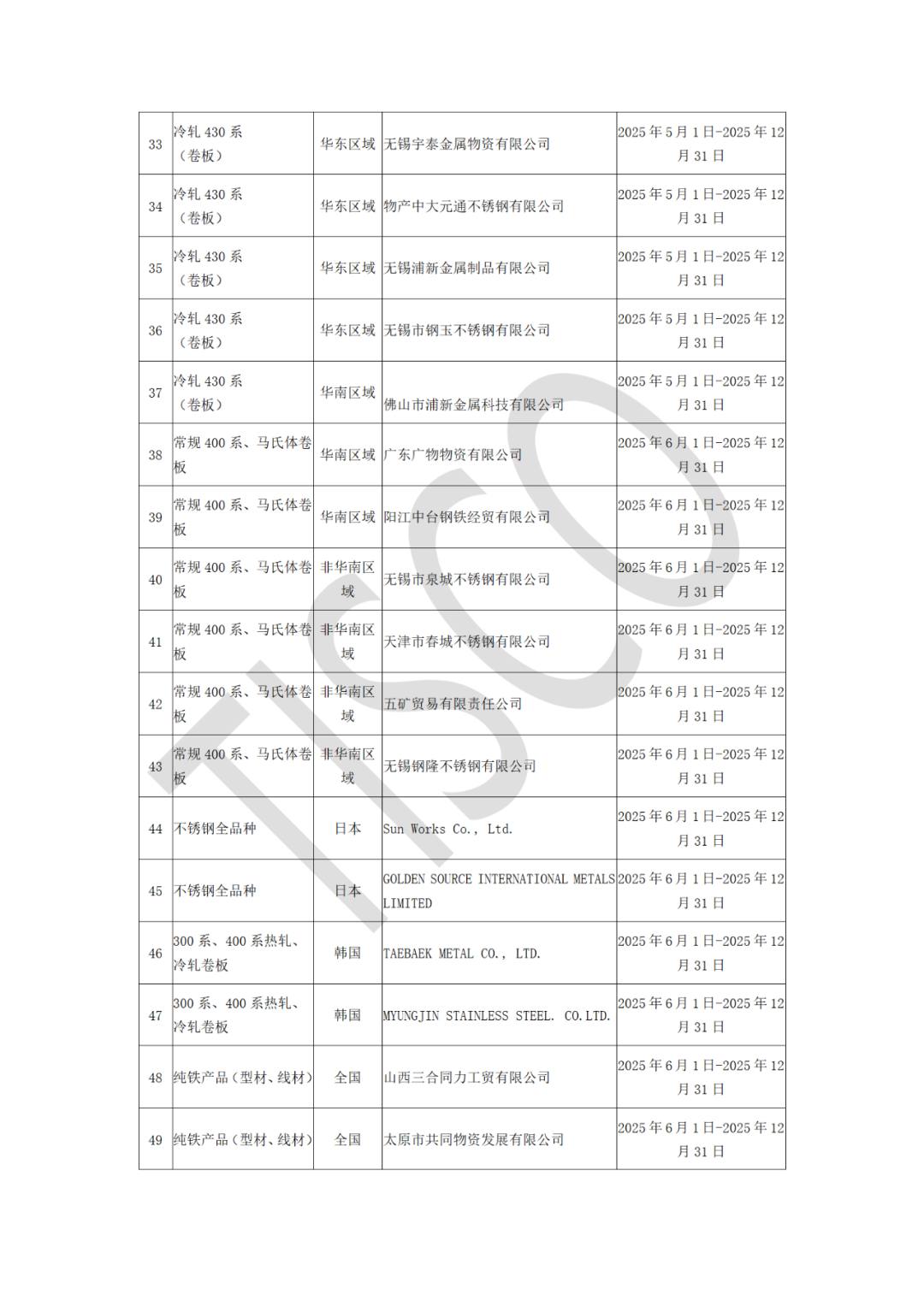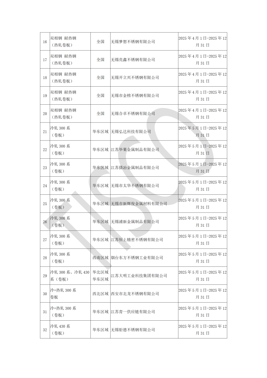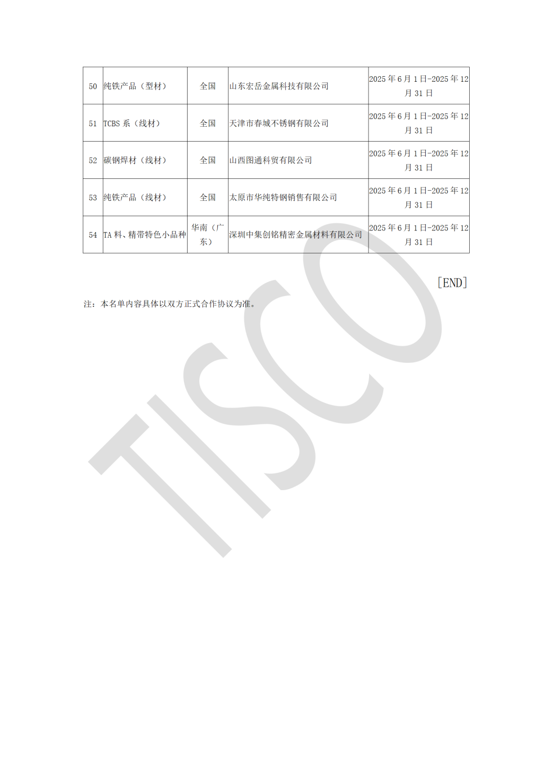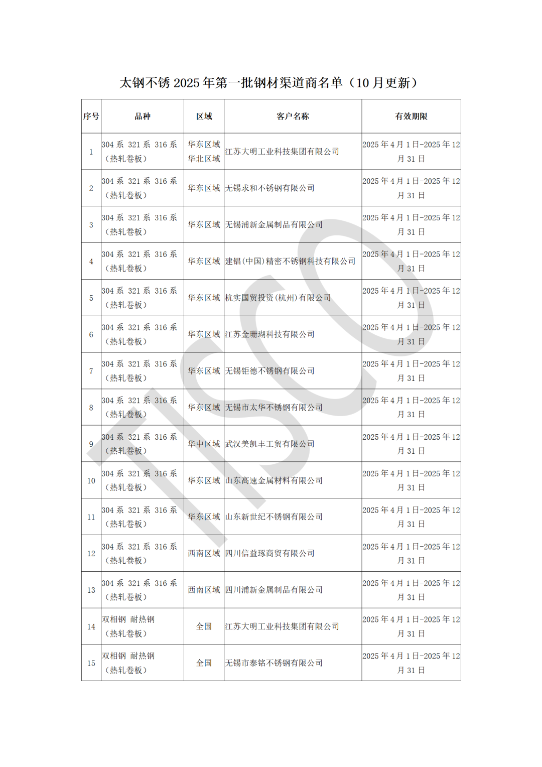 为维护渠道体系健康有序发展,保障合作各方权益,根据太钢不锈营销中心管理文件及双方签定的2025年度供货意向协议中执行规则,针对2025年第一批钢材渠道商运行情况开展动态更新。截止到10月,部分渠道商因累计2次未完成目标订货量,已按约定退出渠道商名单。 现将更新后的太钢不锈2025年第一批钢材渠道商名单予以公布(详见附件),原太钢不锈2025年第一批钢材渠道商名单同时废止。