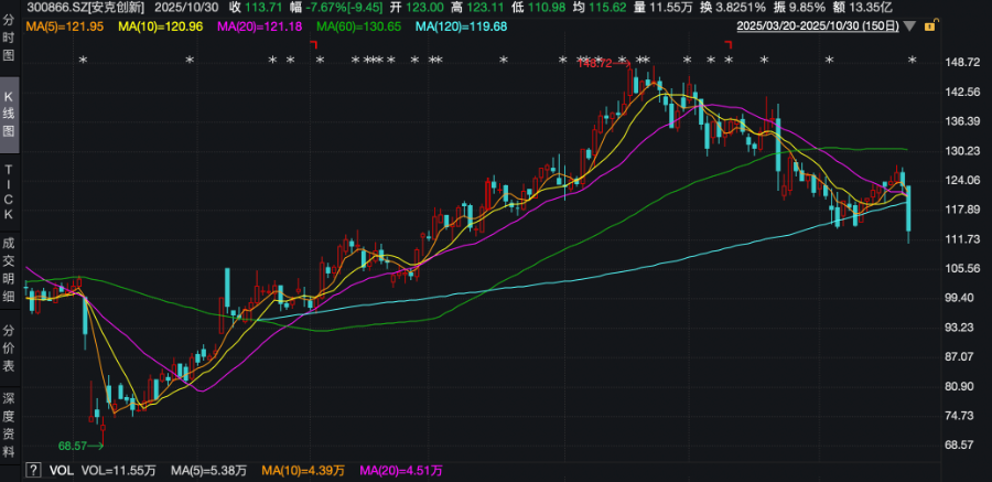 在外部局势风云变幻,公司业务又高度依赖海外市场的情况下,安克创新能实现营收利润双位数增长并不容易。不过,财报发出后,资本市场似乎对这一份成绩仍不满意,截至记者发稿,安克创新股价大跌8.25%,报113元/股,市值逼近600亿元。