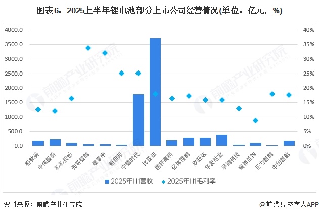 2025上半年锂电池代表性企业收入中,最高的是比亚迪,超过3500亿元,宁德时代为1788亿元,毛利率为25%,是所有企业中最高。亿纬锂能为281.7亿元,毛利率为17.3%,尽管和宁德时代差距较大,但是在上市公司中收入规模庞大。欣旺达收入为26.9亿元,毛利率为15.8%,国轩高科收入为19.39亿元,毛利率为16.4%。孚能科技收入较低,为43.5亿元,毛利率13%。