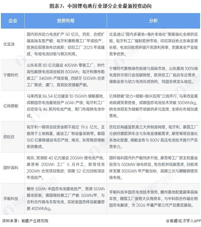 从中国锂电池产业代表性企业的对外投资来看,2025年国内动力电池头部企业加速全球化与技术迭代。海外在欧美、东南亚等地建基地贴近市场以应对贸易壁垒,国内推进产能扩张与电池回收形成闭环。同时聚焦绿电工厂、固态电池等技术突破,以“国内+海外”策略强化产业链与技术竞争力。锂电池产业代表性上市企业最新投资动向如下: