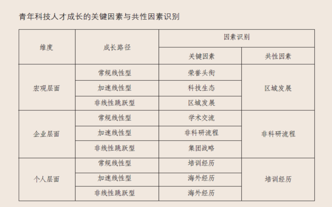 本文通过分析潜在影响因素,依据“宏观—企业—个人”因素协同演化分析框架,揭示了不同影响主体层面中央企业青年科技人才成长路径驱动机制,并结合线性与非线性成长路径理论,进一步识别和分析关键影响因素及共性影响因素,如下表所示。