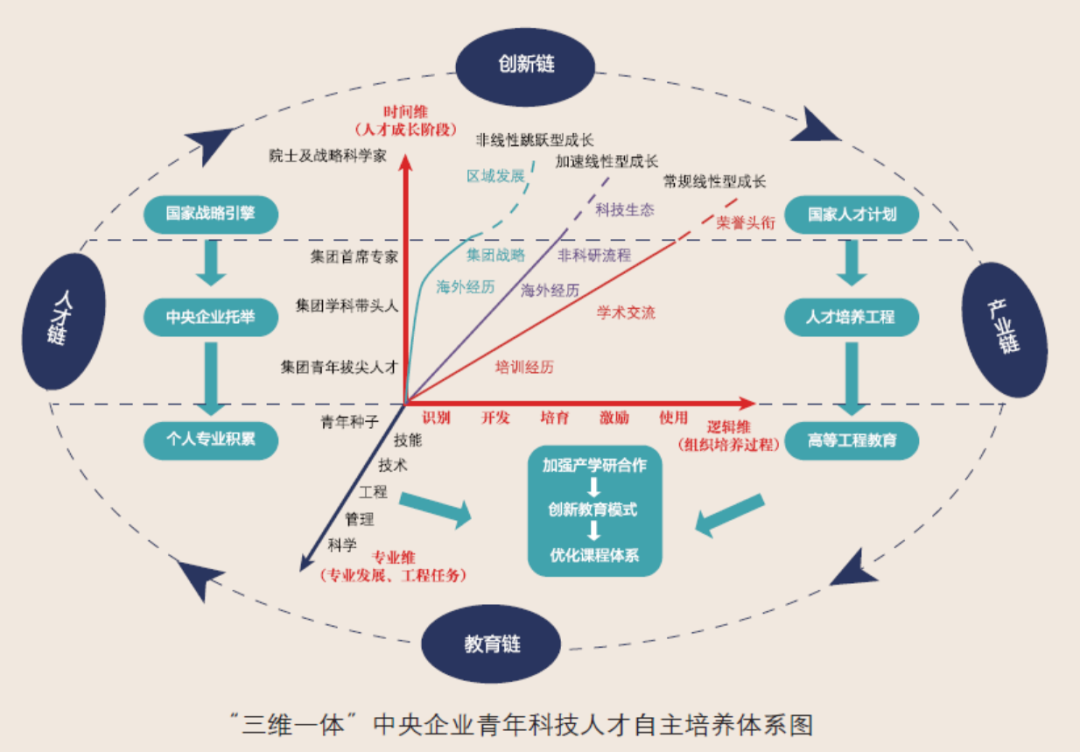发挥企业主体作用,围绕产业链与人才链,建立培养协同机制。以国家重大需求和重大科技专项为牵引,构建“需求定义—能力培养—成果转化”全链条协同机制,实现产业市场需求牵引、人才涌现辈出、技术成果转化应用上下贯通的动态机制,助力人才梯队成长;依托中央企业作为产业链“链长”作用,设立产业技术研究院,将青年科技人才培养嵌入国产替代、“卡脖子”技术攻关等实战场景,实现产业链、人才链与创新链深度咬合与价值共生;在国家政策框架下,中央企业构建“国家战略导向—企业平台赋能—个体能力跃迁”三级联动培养机制,通过优化人才制度、实施人才工程、发布担纲重大工程办法、建立专业科研档案等举措,实现青年科技人才培养与国家人才计划相衔接,加快人才进阶成长和协同培养闭环管理。