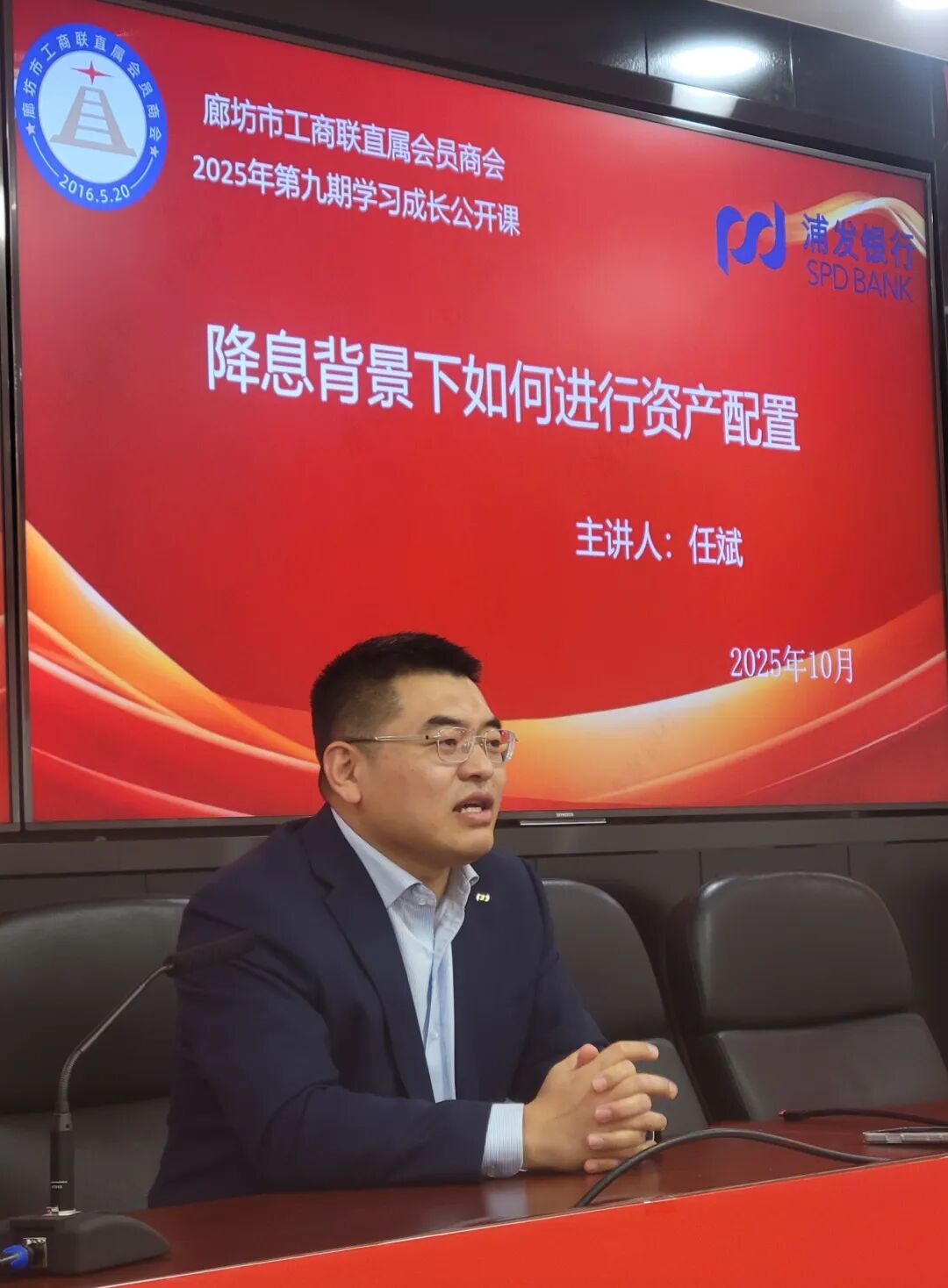 本次公开课特邀浦发银行廊坊分行副行长任斌担任主讲嘉宾。他结合当前宏观经济形势,系统阐述了降息周期对企业及个人资产配置的影响,并提出一系列具有实践意义的建议:1、应理性看待资本市场波动,避免盲目跟风,恪守长期投资理念;2、需不断提升金融专业知识与风险识别能力,增强财务决策的科学性;3、积极运用人工智能等智能工具,提升资产配置的精准度与决策效率;4、回归价值投资本质,把握经济运行规律,在复杂环境中捕捉确定性机会。