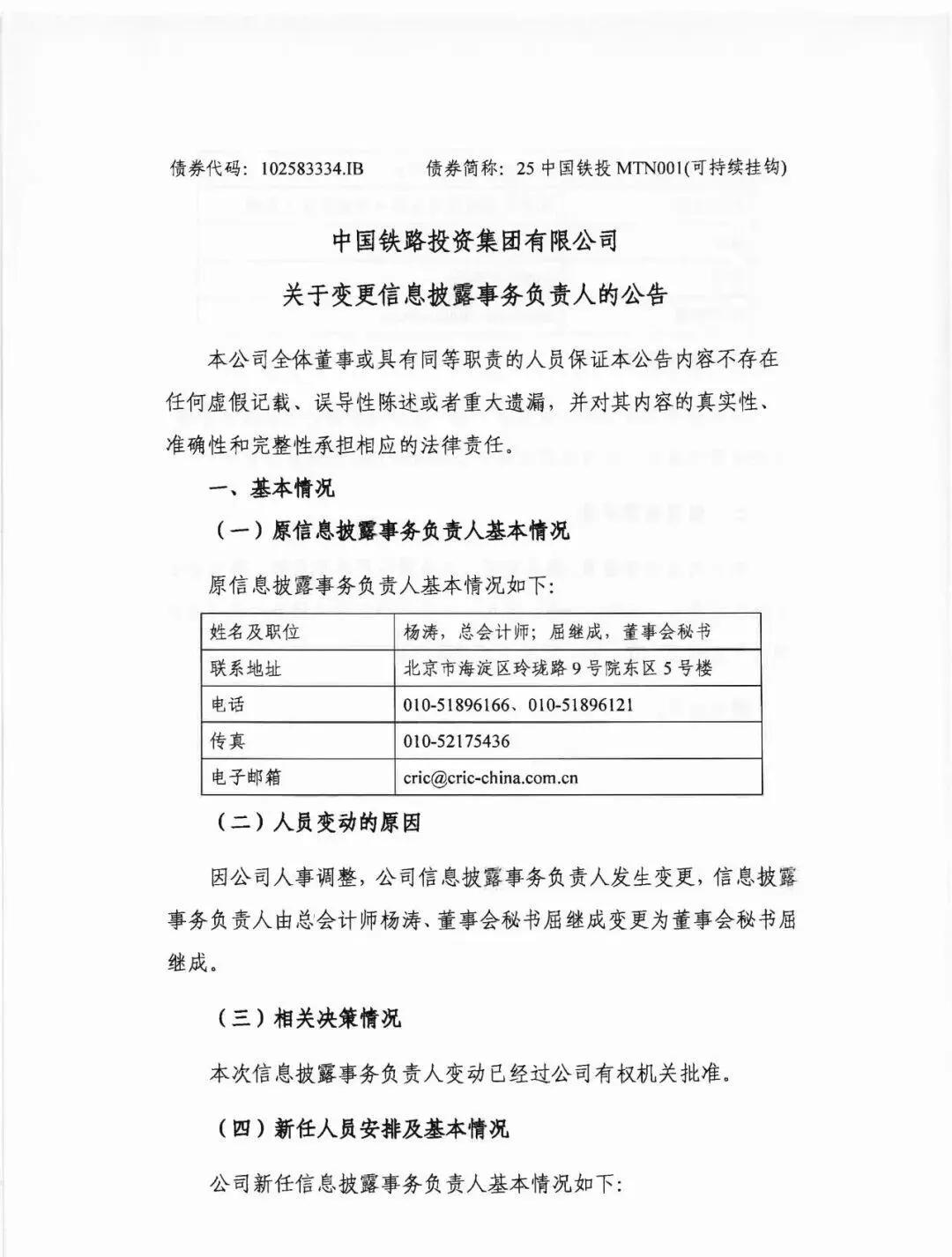 12、中国铁路投资集团有限公司披露事务负责人变更