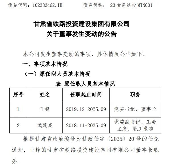 10、甘肃省铁路投资建设集团有限公司董事长调整