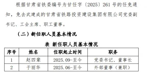 根据甘肃省政府国资委编号为甘政任字〔2025〕6 号的 任免通知,于丽华为甘肃省铁路投资建设集团有限公司外 部董事职务(兼职)。