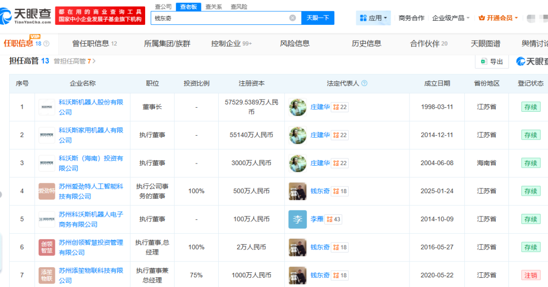 天眼查信息显示,截至目前,钱东奇在科沃斯、科沃斯家用机器人有限公司、科沃斯(海南)投资有限公司等6家存续企业中担任高管。