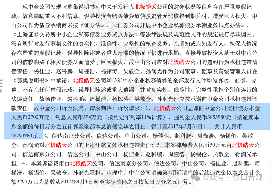 债券违约后,在债券持有人会议上,中金创新未接受北极皓天的债转股安排,选择以诉讼方式解决争议。要求北极皓天支付本金2700万元、利息594万元、违约金人民币385.40万元,共计3679.40万元,并要求中山证券以及两担保公司对该债务承担连带责任。该金额的利息和违约金仅计算至2017年3月,也就是说现在的索赔金额会更高。
