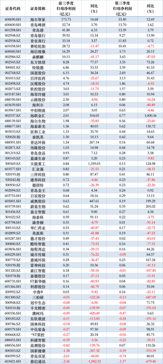 从第三季度来看,海尔智家以53.40亿元净利润稳坐榜首,青岛啤酒、青岛港、青农商行和赛轮轮胎突破10亿元大关,51家实现盈利,14家出现亏损,盈利面78.46%。