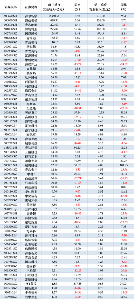 具体来看,2025年前三季度,海尔智家实现营业收入2340.54亿元,位居营业收入榜首位。海信视像、青岛啤酒前三季度实现营业收入428.30亿元、293.67亿元,分别榜单第二、第三位。前三季度营业收入突破十亿元大关的公司有40家。