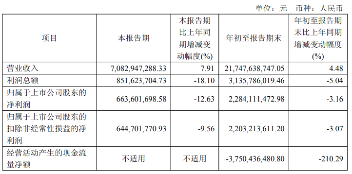 报告显示,第三季度,中国通号营业收入约70.82亿元,同比增长7.91%;归属于上市公司股东的净利润约6.63亿元,同比下降12.63%。