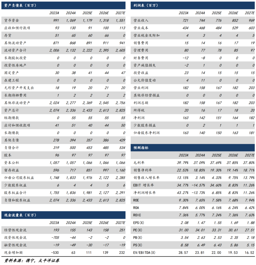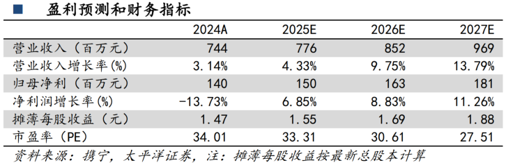 我们预计2025年-2027年公司营收为7.76/8.52/9.69亿元,同比增长4.33%/9.75%/13.79%;归母净利为1.50/1.63/1.81亿元,同比增长6.85%/8.83%/11.26%,对应PE为33/31/28倍,持续给予“买入”评级。