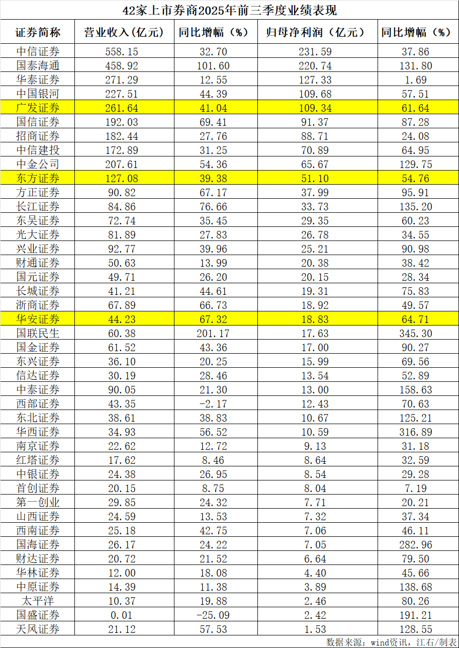 上市公司2025年三季报披露收官,42家纯券商上市公司业绩也随之出炉。由于股票市场持续回升,券商业绩普遍大幅增长,财富管理业务和自营业务是券商业绩增长的主要动力来源。