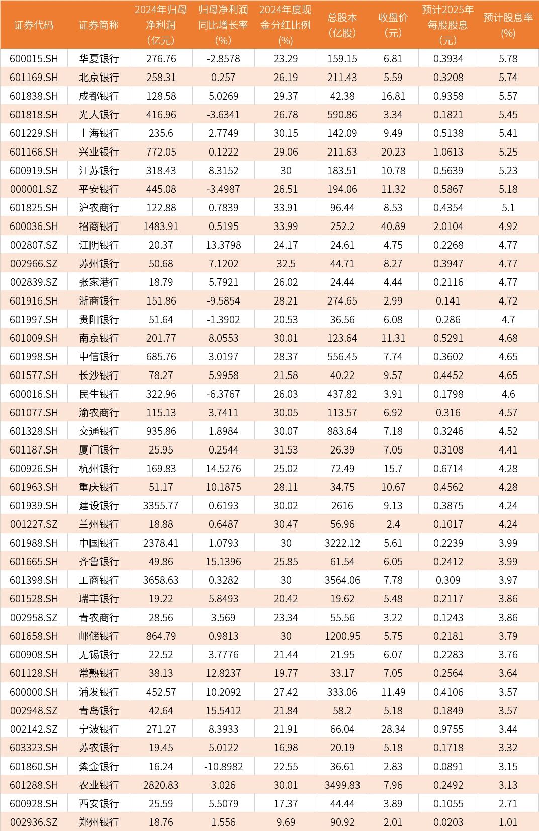 预计股息率是这样计算的,假定银行股今年全年的净利润增长率与前三季度相同,根据去年全年的净利润,我们可以大致推算出银行股2025年全年的净利润。如果2025年银行股的分红比例与2024年持平,我们可以计算2025年银行股的分红总额。再根据10月31日的收盘价和最新的总股本,得出当前银行股的预计股息率水平。