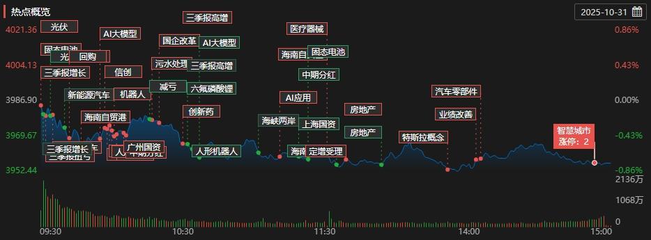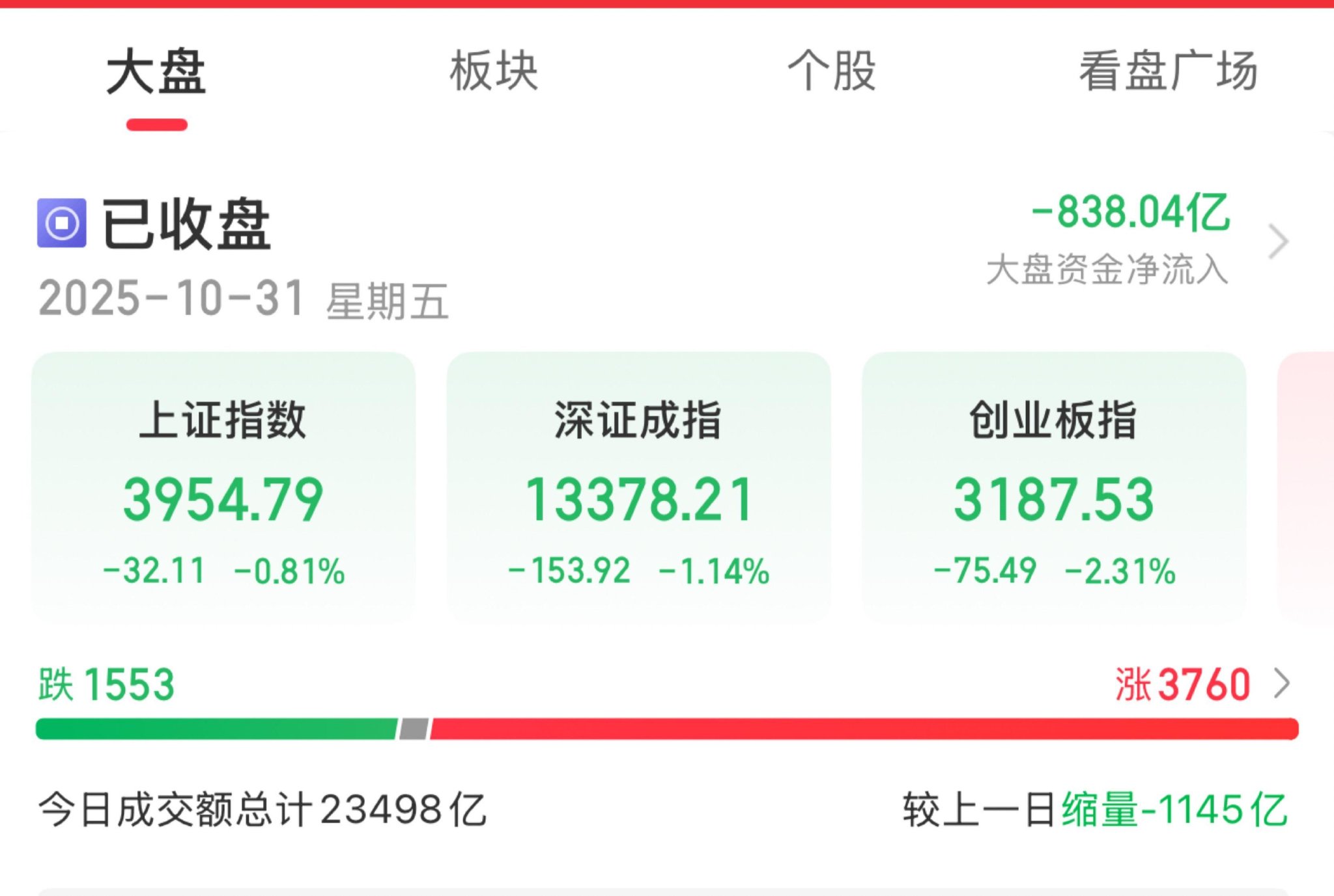 A股10月收官,三大指数今日集体下跌,截至收盘,上证指数跌0.81%,10月累涨1.85%并一度站上4000点。深证成指跌1.14%,10月累跌1.1%。创业板指跌2.31%,10月累跌1.56%。北证50涨1.89%,10月累涨3.54%。沪深京三市全天成交额23498亿元,较上日缩量1145亿元。全市场超3700只个股逆势上涨。