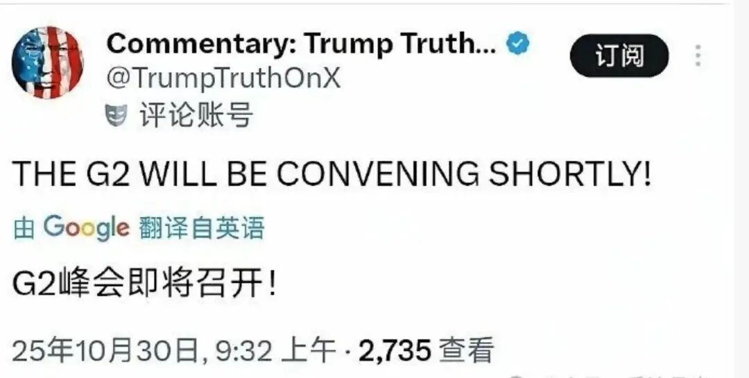 值得一提的是,在前往韩国釜山参加峰会前,特朗普在社交账号上发文,全部用大写字体宣称“G2峰会即将召开!”这一“G2”概念,并非首次出现。2009年,奥巴马曾提出G2构想,当时的背景是西方世界深陷美国次贷危机引发的金融风暴,美国无力独自解决危机,希望中美合作共同主导世界事务。然而,中国对G2并无兴趣,只是通过大力拉动消费,客观上帮助了美国及西方。