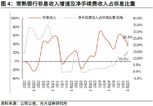 非息收入增长降速,占营收比重降至21.9%。公司前三季度非息收入19.8亿(YoY+35%),占营收比重较1H25下降1.5pct至21.9%。其中,① 净手续费及佣金净收入3亿,同比多增2.4亿,除较低基数外,代理理财业务等手续费收入增加驱动中收维持高增。② 净其他非息收入16.8亿(YoY+20%),增速较上半年下降24.6pct,其中,投资收益16.7亿(YoY+24.6%),增速较年中下降6.3pct;公允价值变动收益-1.6亿,同比多减0.5亿,3Q债券市场利率上行,交易性债券投资价值重估损失对非息收入增长形成拖累。
