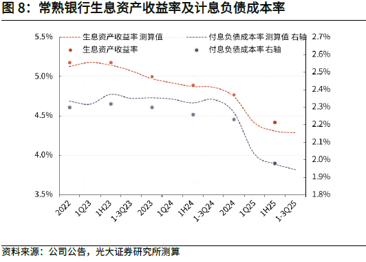 净息差降幅环比收窄,成本管控成效逐步显现。公司前三季度NIM为2.57%,较1H25、2024年分别收窄1bp、14bp,3Q息差降幅进一步收窄,仍居同业首位。我们测算,公司前三季度生息资产收益率较上半年下降2bp,有效需求不足、业内竞争加剧、存量贷款滚动到期等因素叠加影响下,资产端定价仍处在下行通道,但降幅逐季收窄。负债端,测得前三季度付息负债成本率较上半年下降4bp,延续逐季下降趋势。近年来公司多次跟进调降存款挂牌利率,后续伴随存量存款到期滚动重定价,成本管控效果将进一步释放。