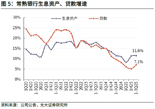 规模扩张强度不减,信贷增速稳中有升。3Q25季末,常熟银行生息资产、贷款同比增速分别为11.6%、7.1%,增速较2Q末分别提升0.2、1.9pct,规模扩张强度不减。季末金融投资、同业资产增速分别为18.1%、30.6%,增速较年中分别变动-6、+3.9pct,非信贷类资产维持较高增速,对资产扩张形成一定支撑。贷款方面,3Q单季贷款新增53亿,较低基数上同比多增45亿,其中公司、零售、票据分别新增30、16、7亿,同比分别多增25亿和32亿、少增12亿,对公贷款仍发挥“压舱石”作用,资产定价下行背景下,适度压降低息票据,零售贷款在去年较低基数上同比多增。