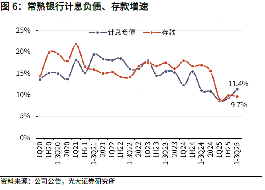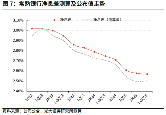 存款稳步增长,定期化趋势有放缓迹象。3Q25末,常熟银行付息负债、存款同比增速分别为11.4%、9.7%,分别较2Q末变动+1.9、-0.2pct。3Q单季存款新增14亿,同比少增4亿;其中定期、活期存款分别新增6亿、4亿,同比分别少增1亿、3亿。季末定期存款占比71.8%,较年中下降0.14pct,较年初下降0.53pct,定期化趋势逐步缓解。季末储蓄存款中两年期以下占比50.3%,较年初提升3.4pct,储蓄存款出现短久期化趋势。