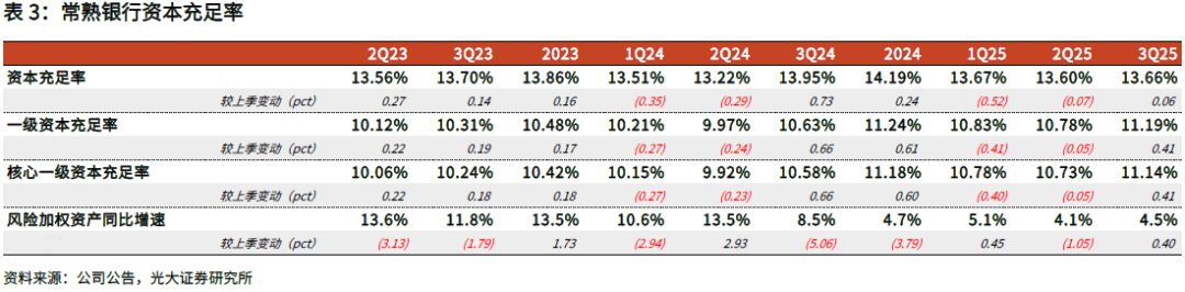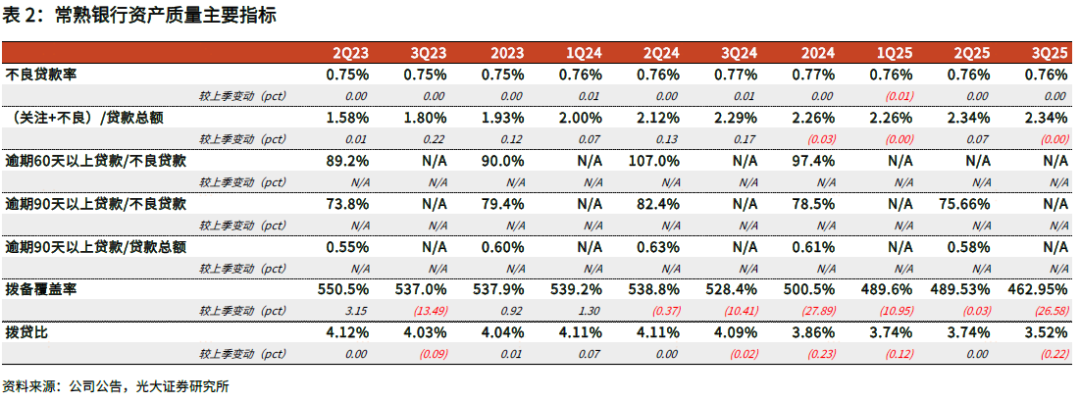 不良率维持低位,风险抵补能力较强。3Q25末,常熟银行不良率、关注率分别为0.76%、1.58%,均同年中持平,资产质量核心指标运行稳定。拨备方面,3Q单季公司贷款损失准备新增2.3亿,同比少增0.7亿。季末拨贷比、拨备覆盖率分别为3.52%、463%,分别较年中下降0.2、26.6pct,拨备计提强度有所放缓,对盈利增长形成一定托举,风险抵补能力保持稳健。