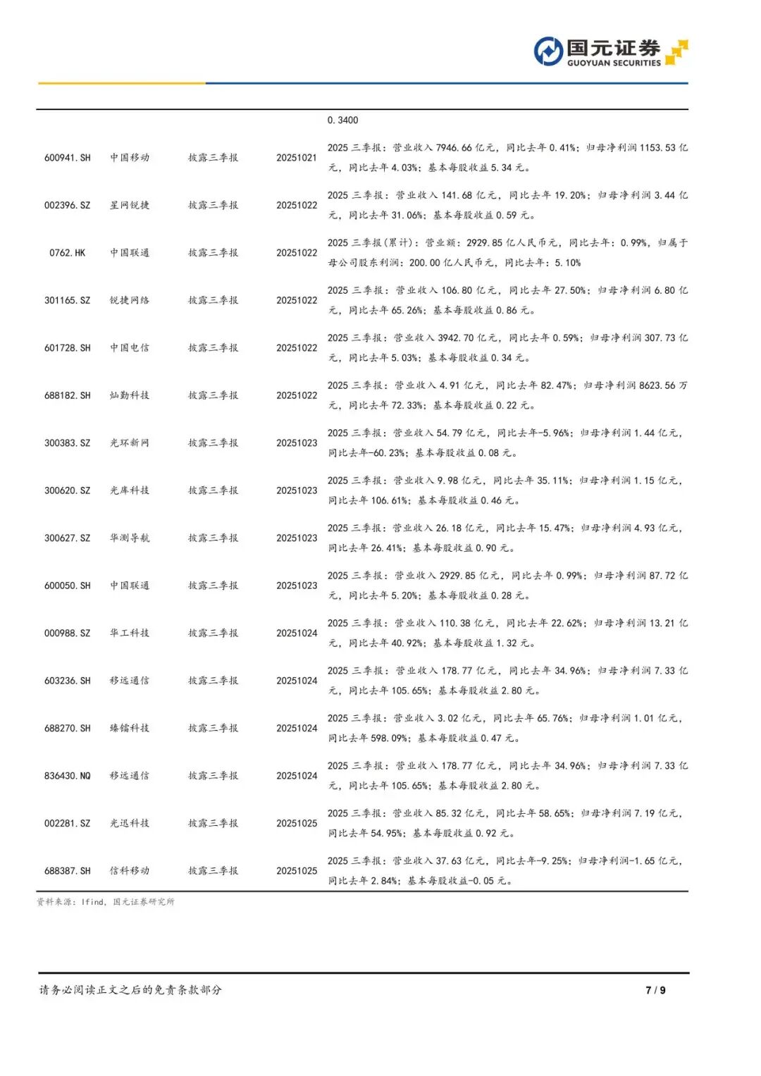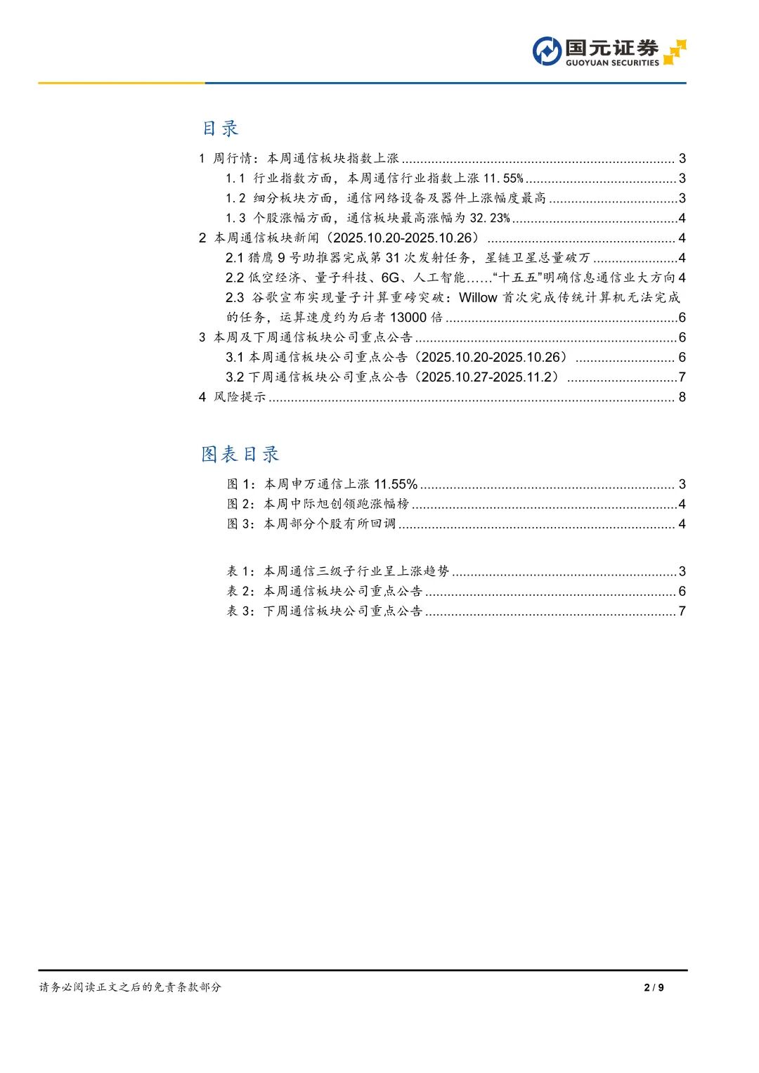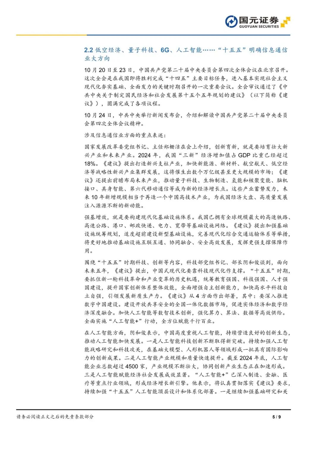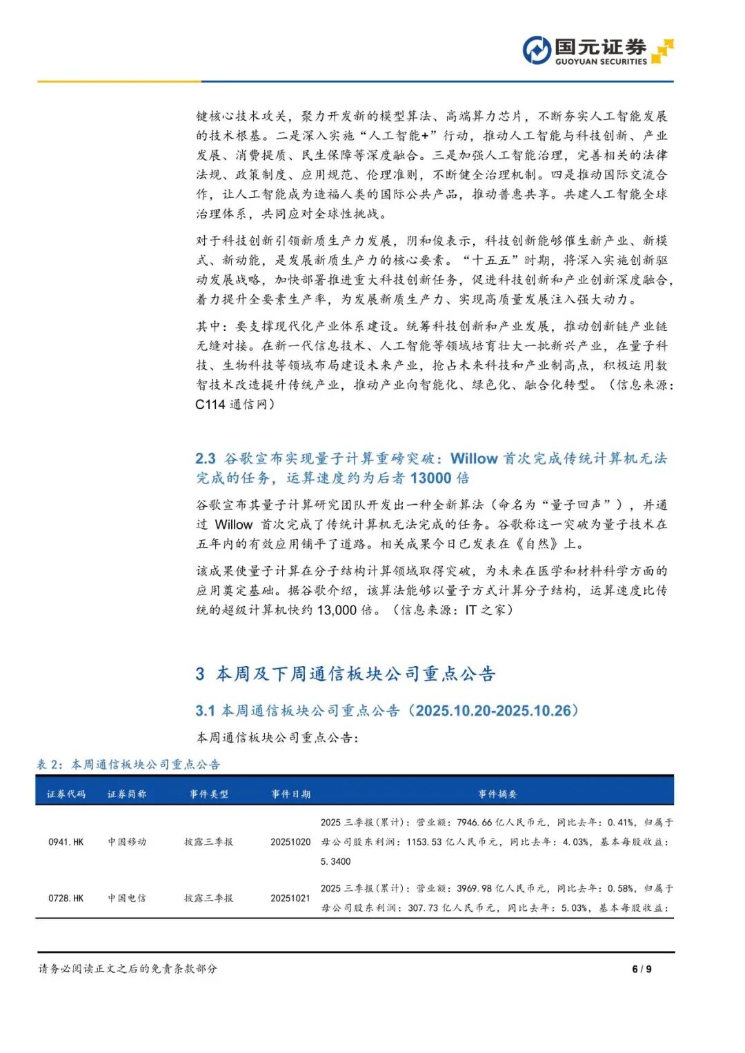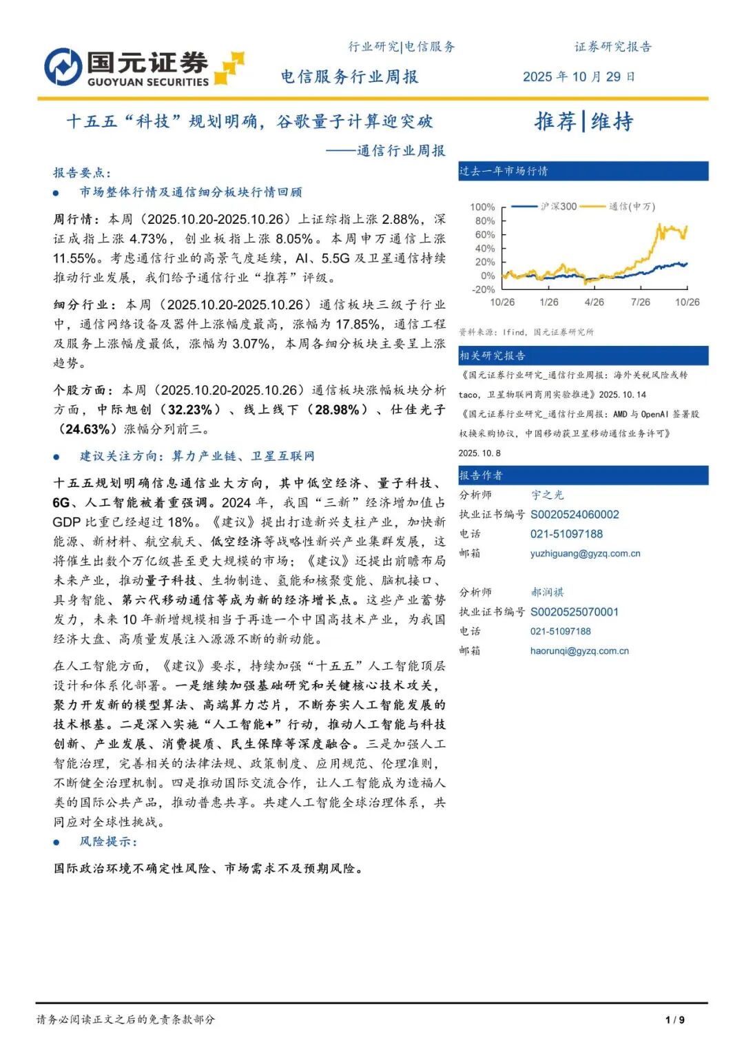 本报告摘自国元证券2025年10月29日已发布的《十五五“科技”规划明确,谷歌量子计算迎突破——通信行业周报》,具体报告及分析内容请详见报告。若因对报告的摘编等产生歧义,应以报告发布当日的完整内容为准。