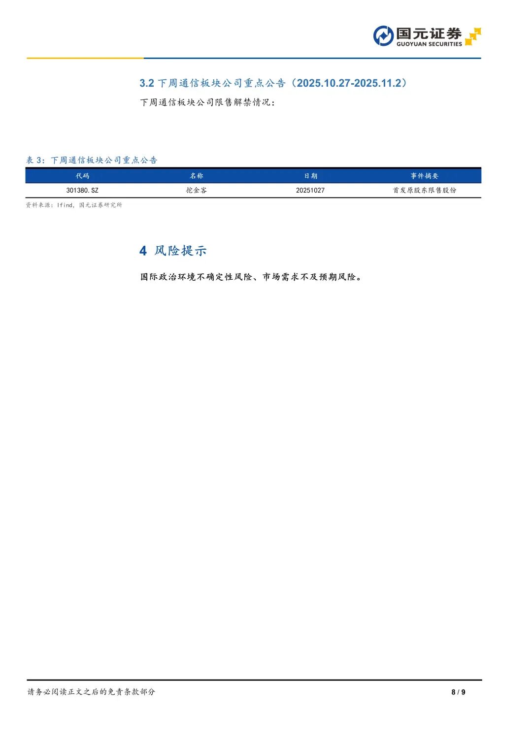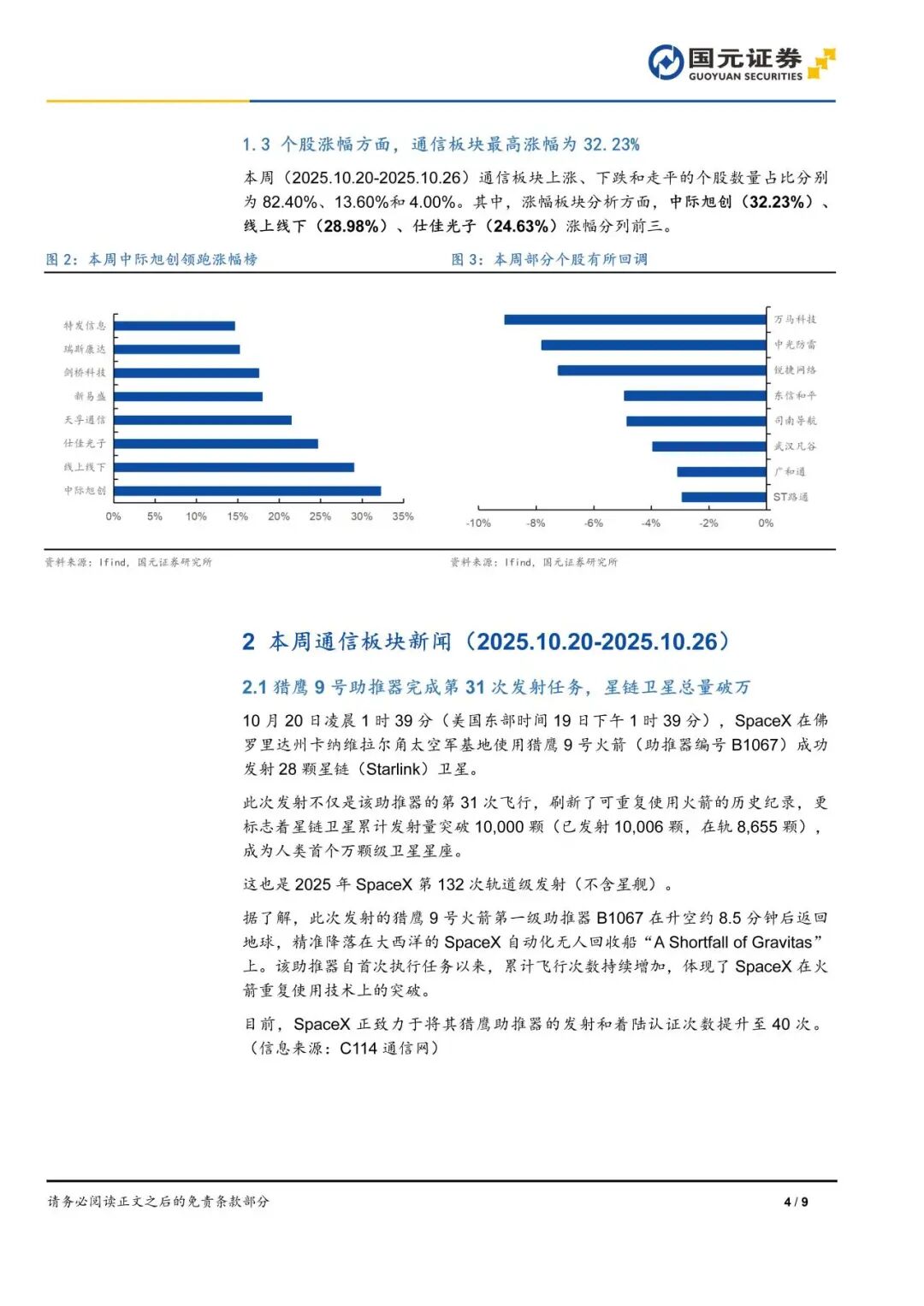 个股方面:本周(2025.10.20-2025.10.26)通信板块涨幅板块分析方面,中际旭创(32.23%)、线上线下(28.98%)、仕佳光子(24.63%)涨幅分列前三。