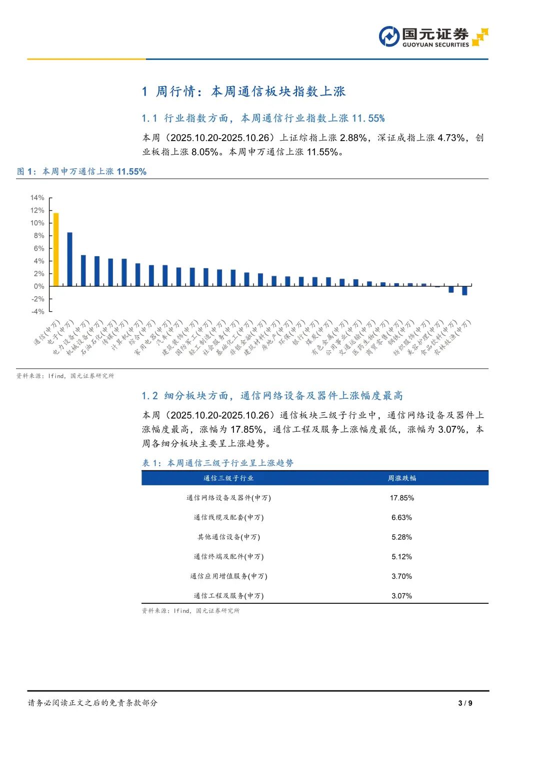 周行情:本周(2025.10.20-2025.10.26)上证综指上涨2.88%,深证成指上涨4.73%,创业板指上涨8.05%。本周申万通信上涨11.55%。考虑通信行业的高景气度延续,AI、5.5G及卫星通信持续推动行业发展,我们给予通信行业“推荐”评级。
