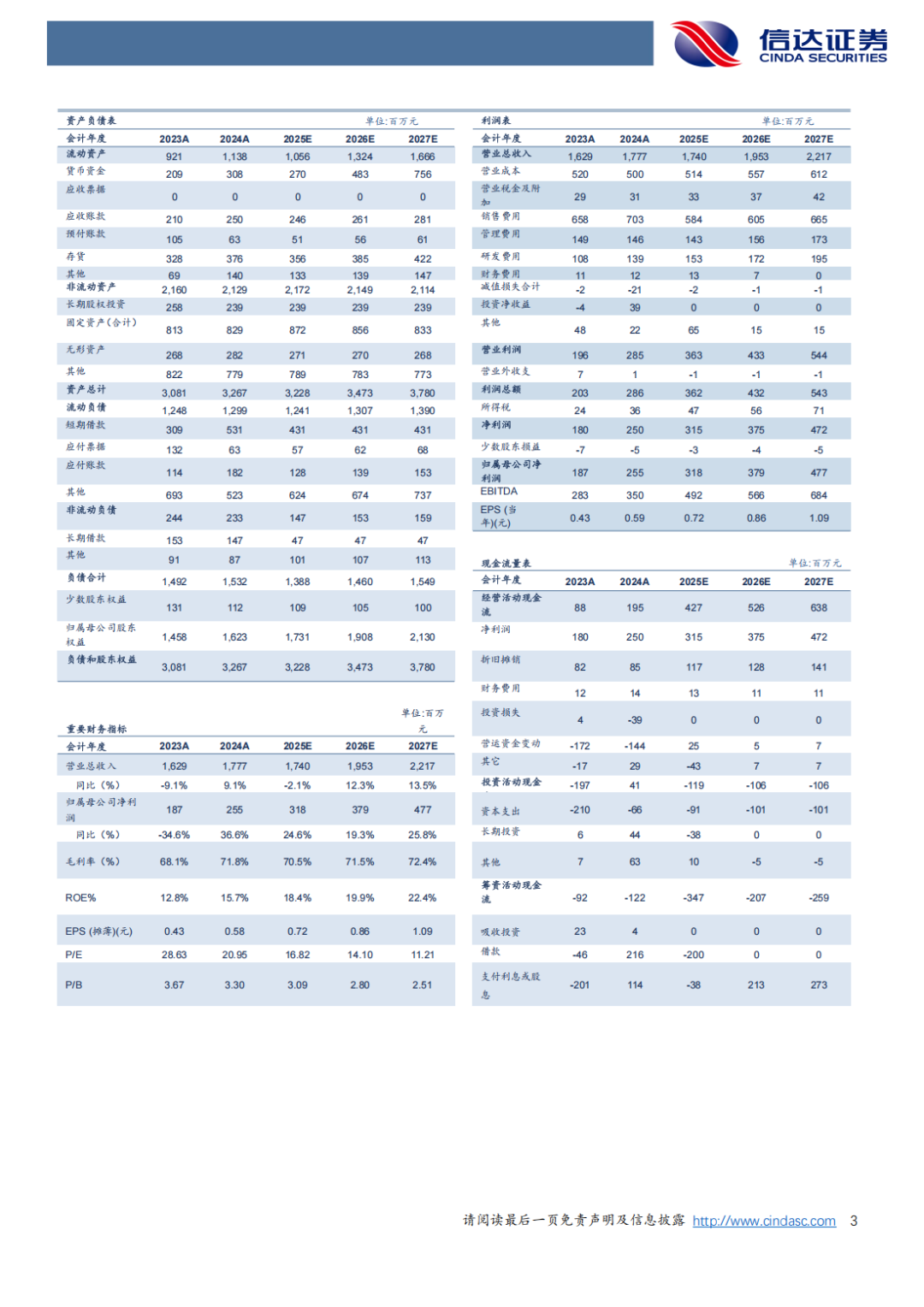 盈利预测:我们预计公司2025-2027年营业收入分别为17.4亿元、19.53亿元、22.17亿元,同比增速分别约为-2.1%、12.3%、13.5%,实现归母净利润分别为3.18亿元、3.79亿元、4.77亿元,同比分别增长约24.6%、19.3%、25.8%,对应当前股价PE分别约为17倍、14倍、11倍。