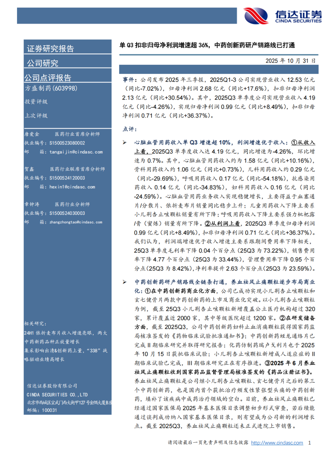 ①从收入上看,2025Q3单季度收入达4.19亿元,同比增速为-4.26%,环比增速为0.7%。其中,心脑血管用药收入约为1.58亿元(同比+10.16%),骨科用药收入约1.06亿元(同比+0.73%),儿科用药收入约0.29亿元(同比-29.69%),呼吸用药收入0.17亿元(同比-54.18%),抗感染用药收入0.14亿元(同比-34.83%),妇科用药收入0.16亿元(同比-24.59%)。心脑血管用药业务收入实现稳健增长,主要得益于血塞通片/分散片、依折麦布片销量同比稳步上升;儿童用药收入下降主要系小儿荆杏止咳颗粒销量有所下降;呼吸用药收入下降主要系强力枇杷露/膏(蜜炼)销量有所下降。②从利润上看,2025Q3单季度归母净利润0.99亿元(同比+8.49%),扣非归母净利润0.71亿元(同比+36.37%)。我们认为,利润端增速优于收入增速主要系跟期间费用率下降相关,25Q3单季度毛利率下降0.04个百分点(25Q3为73.22%),销售费用率下降4.77个百分点(25Q3为33.44%),管理费用率下降0.95个百分点(25Q3为8.42%),净利率提升2.63个百分点(25Q3为23.59%)。中药创新药研产销路线全链条打通,养血祛风止痛颗粒逐步布局商业化