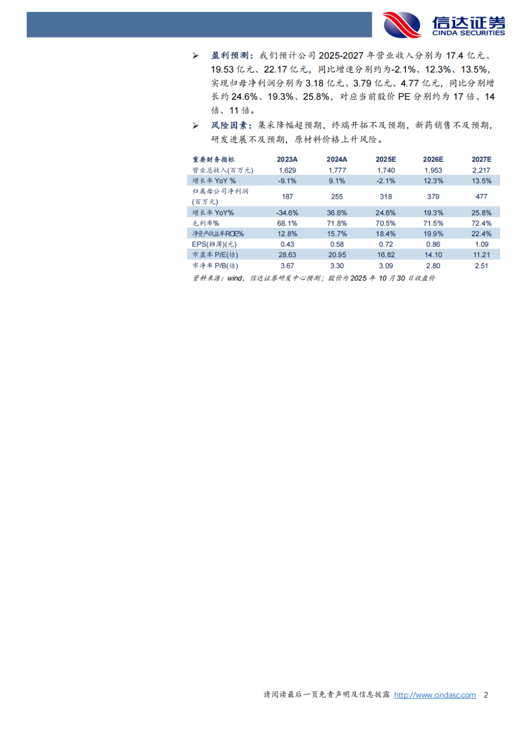 风险因素:集采降幅超预期,终端开拓不及预期,新药销售不及预期,研发进展不及预期,原材料价格上升风险。