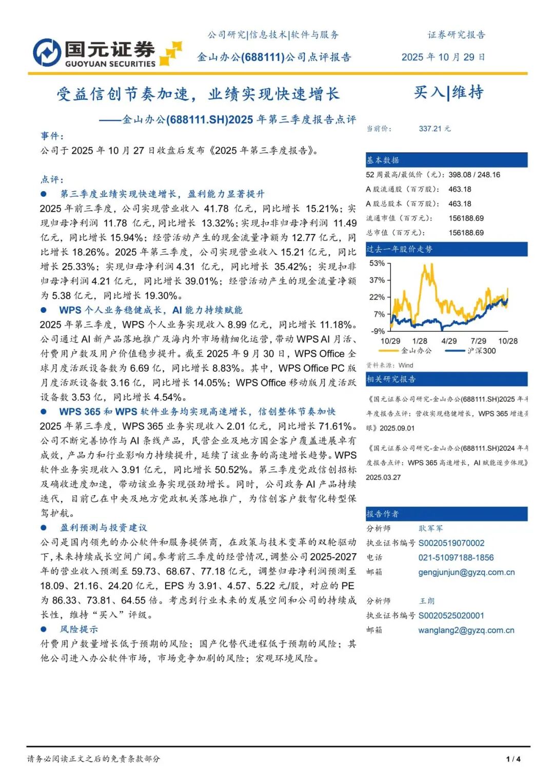 本报告摘自国元证券2025年10月29日已发布的《受益信创节奏加速,业绩实现快速增长——金山办公(688111.SH)2025年第三季度报告点评》,具体报告及分析内容请详见报告。若因对报告的摘编等产生歧义,应以报告发布当日的完整内容为准。