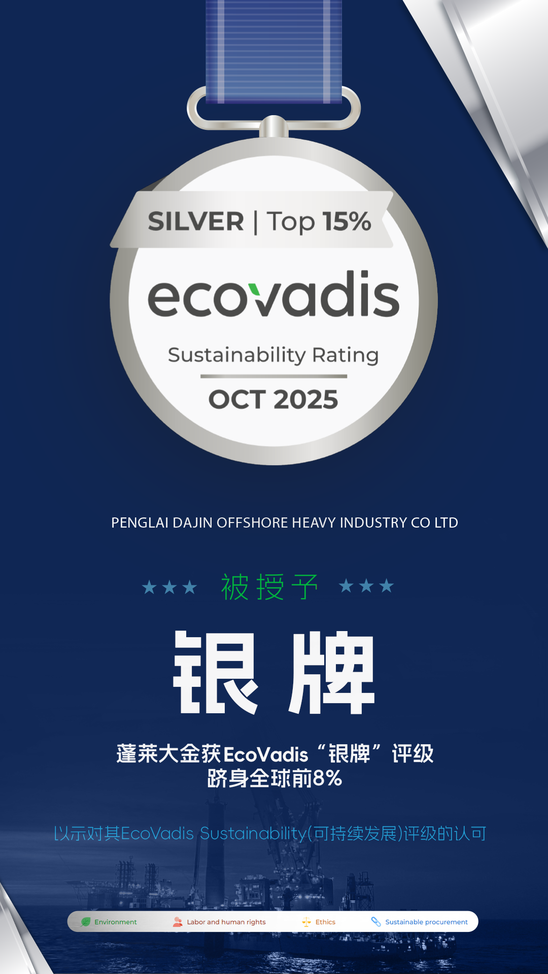 近日,全球权威可持续发展评级机构 EcoVadis披露最新企业社会责任评级结果,大金重工子公司蓬莱大金海洋重工有限公司凭借在环境管理、责任治理与可持续供应链建设方面的卓越表现,荣获 EcoVadis“银牌”认证,以75分的总成绩位列全球超过15万家参评企业的前8%。
