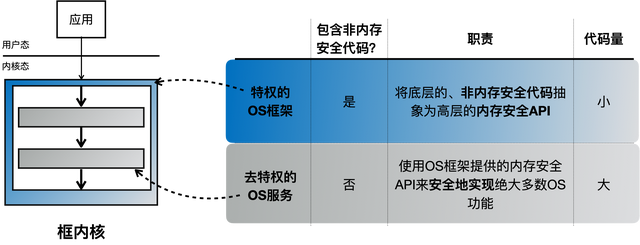 星绽的“框内核”架构,敏锐地抓住了Rust语言崛起的历史机遇,试图“鱼与熊掌兼得”。它将整个操作系统内核划分为两部分:特权的“OS框架”和去特权的“OS服务”。OS框架负责将底层非内存安全的Rust代码封装为高层次、内存安全的接口;而OS服务则完全使用Rust语言中的安全部分进行开发,构建操作系统的大部分功能模块。