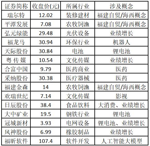 涨停板个股中,股价创出近一年新高的个股有15只(不包括创出历史新高的个股),包括瑞尔特、平潭发展、弘元绿能、福龙马、天际股份、粤传媒、合富中国、采纳股份、福建金森、欢瑞世纪、日辰股份、大中矿业、冠城新材、风神股份、福昕软件,具体如下表所示。