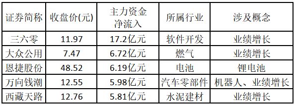 从主力资金来看,今日涨停板个股中,主力资金净流入金额排名前5的个股分别为三六零、大众公用、恩捷股份、万向钱潮、西藏天路。