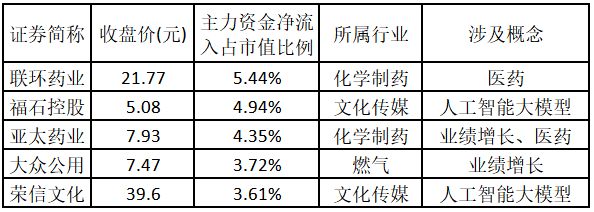 主力资金净流入金额占市值比例排名前5的个股分别为联环药业、福石控股、亚太药业、大众公用、荣信文化。