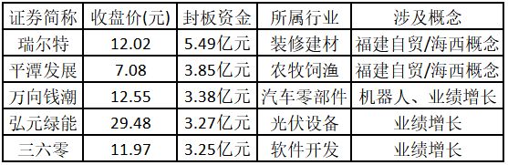 从封板资金来看,今日涨停板个股中,封板资金排名前5的个股包括瑞尔特、平潭发展、万向钱潮、弘元绿能、三六零。欢迎大家关注微信公众号“道达号”,其“道达涨停复盘”栏目为大家解读。