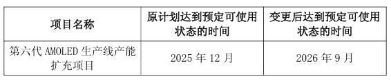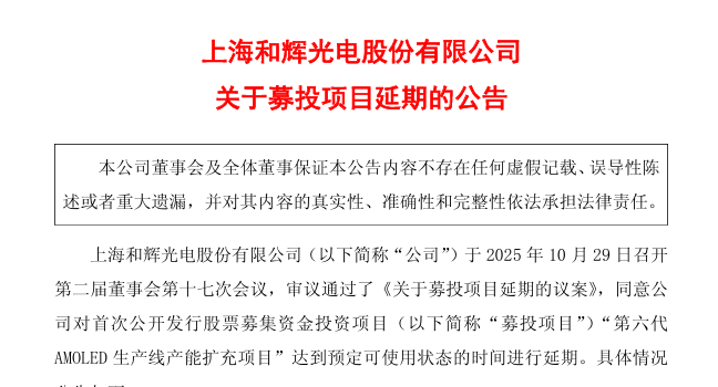 10月31日,国内AMOLED面板厂商和辉光电发布公告,宣布其核心募投项目“第六代AMOLED生产线产能扩充项目”延期9个月,该项目原定2025年12月达到预定可使用状态,现调整至2026年9月。
