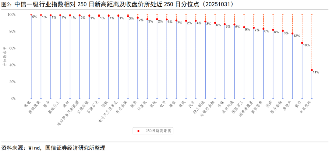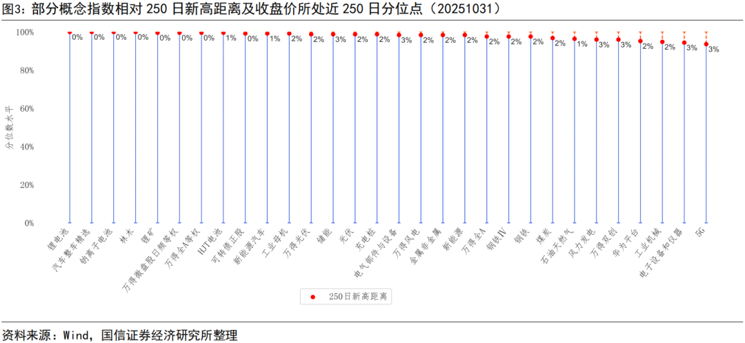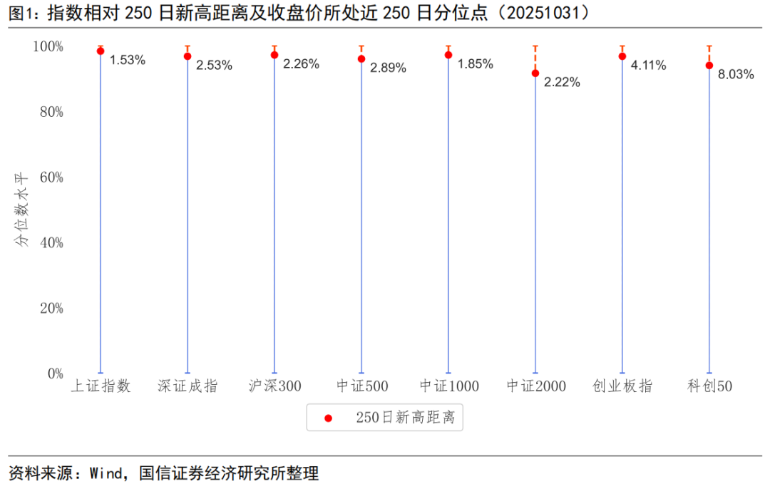 截至2025年10月31日,上证指数、深证成指、沪深300、中证500、中证1000、中证2000、创业板指、科创50指数250日新高距离分别为1.53%、2.53%、2.26%、2.89%、1.85%、2.22%、4.11%、8.03%。中信一级行业指数中家电、纺织服装、综合、基础化工、建材行业指数距离250日新高较近,食品饮料、银行、房地产、综合金融、医药行业指数距离250日新高较远。概念指数中,锂电池、汽车整车精选、钠离子电池、林木、锂矿、万得微盘股日频等权、万得全A等权等概念指数距离250日新高较近。